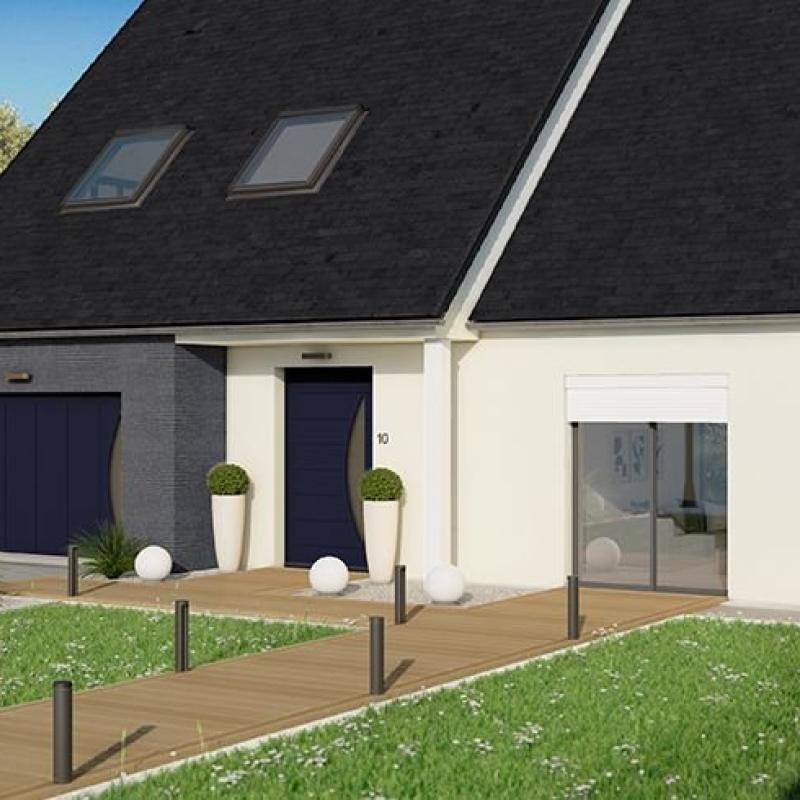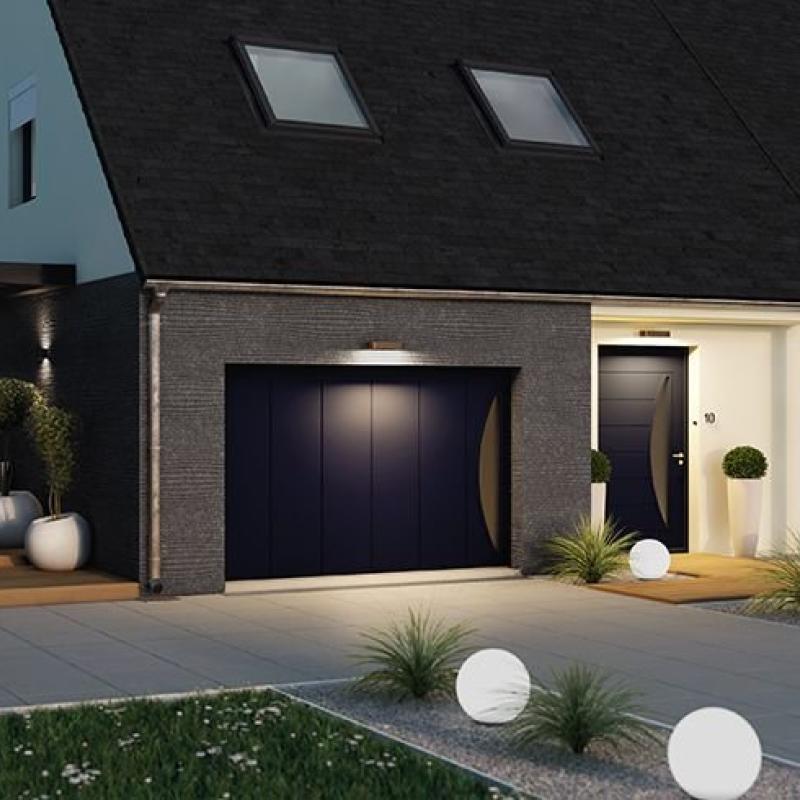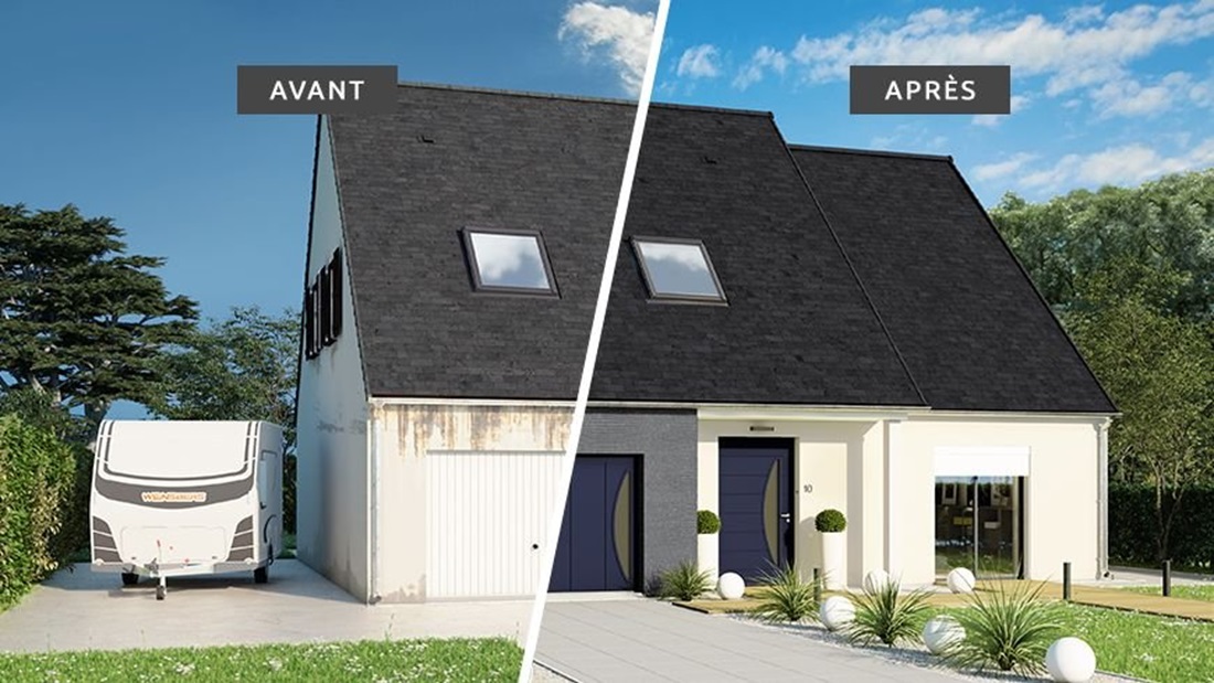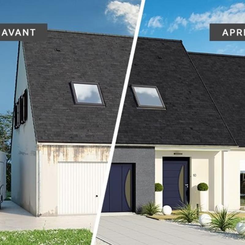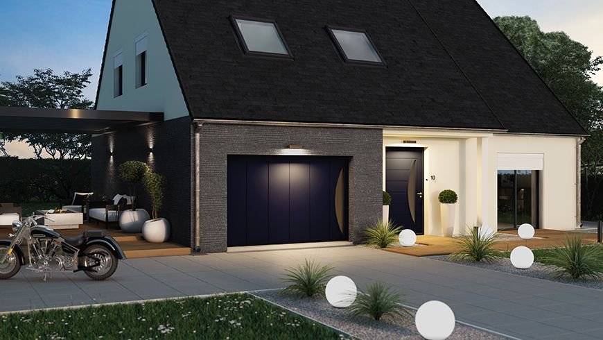Pour moderniser cette maison de lotissement, il a fallu oser la texture et la couleur. Contrastant avec le blanc de la façade, le volume du garage est souligné par un enduit anthracite à texture géométrique, et les portes d'entrée et du garage remplacées par des modèles Aluminium bleu acier, pour allier design, sécurité et économies d’énergie. Les volets battants sont déposés, les volets roulants motorisés et domotisés. Éclairage et pergola viennent compléter les codes design de la maison.